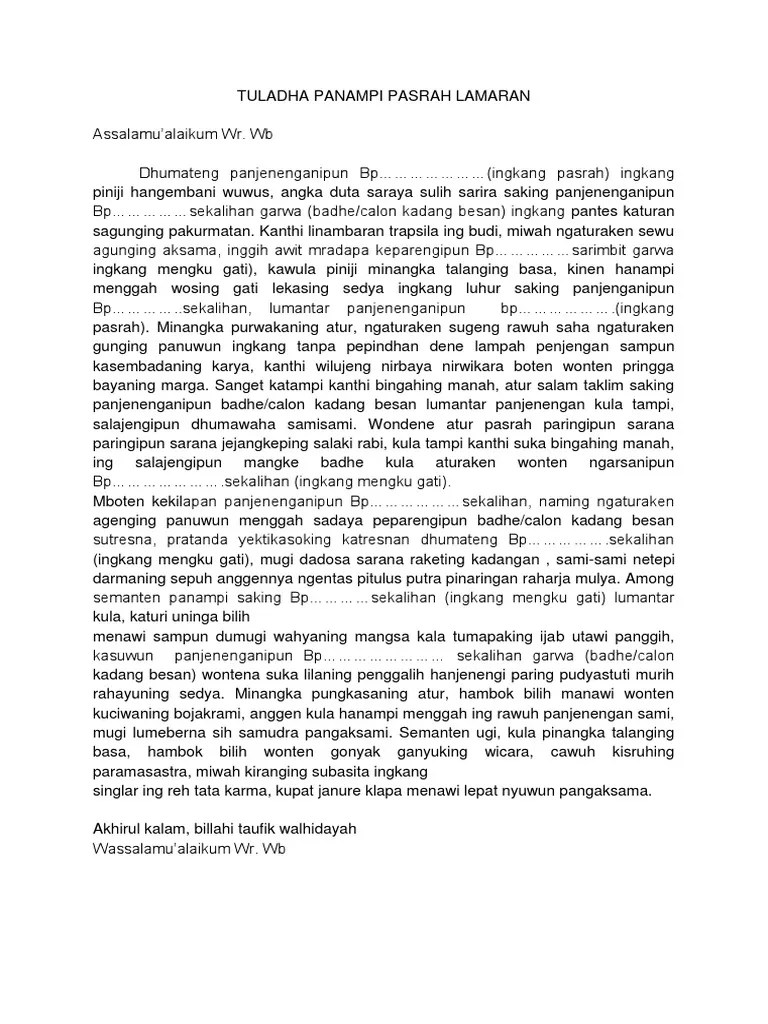 Atur pambagya pasrah lamaran bismillah hirrohman nirrohim assalamu'alaikum wr.wb. 07 09 2014 seperti sering kita jumpai anak jaman sekarang mengucapkan menulis dan berbicara . Para pepundhen, para pinisepuh, para sesepuh ingkang pantes pinundhi, para kadang duta saraya saking calon . Para pepundhen, para pinisepuh, para s. Assalamu alaikum warahmatulahi wabarakatuh, para pepundhen, para sesepuh, para pinisepuh ingkang dhahat kinurmatan, panjeneganipun purna .